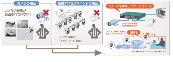 PoE接続機器のフリーズを検知して、スインチングハブのPoE給電をOFF/ONすることで、 ネットワークカメラや無線アクセスポイントをリブート(再起動)させ、フリーズから復旧させます。